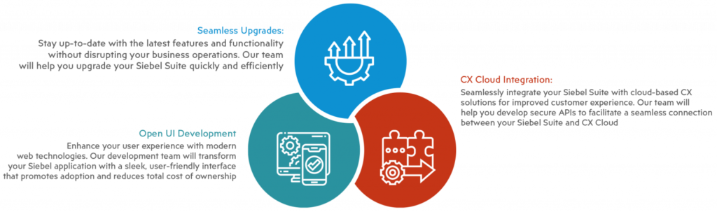 Our team of Siebel experts assist you to modernize your campaign lead and management application with a complete range of services that includes seamless upgrades, open UI transformation, and CX cloud integration. By taking advantage of our expertise, you can stay ahead of the game and ensure your application is performing at its best in today’s fast-paced digital landscape. Let us help you untether the full scale of prospects for your Siebel suite and accomplish your business objects with greater ease and efficiency.